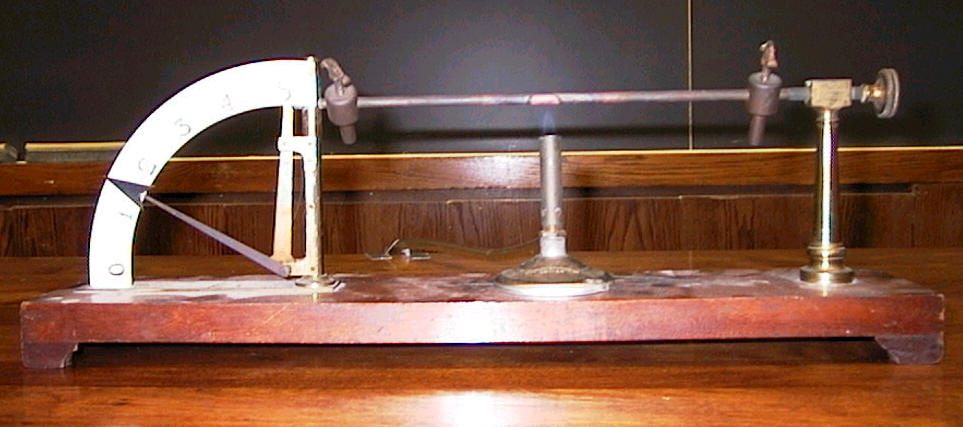 The end of a long metal bar is attached to a sensitive positional scale. Heating the bar with a bunsen burner causes the bar to expand, and the pointer on the scale rises quickly.
